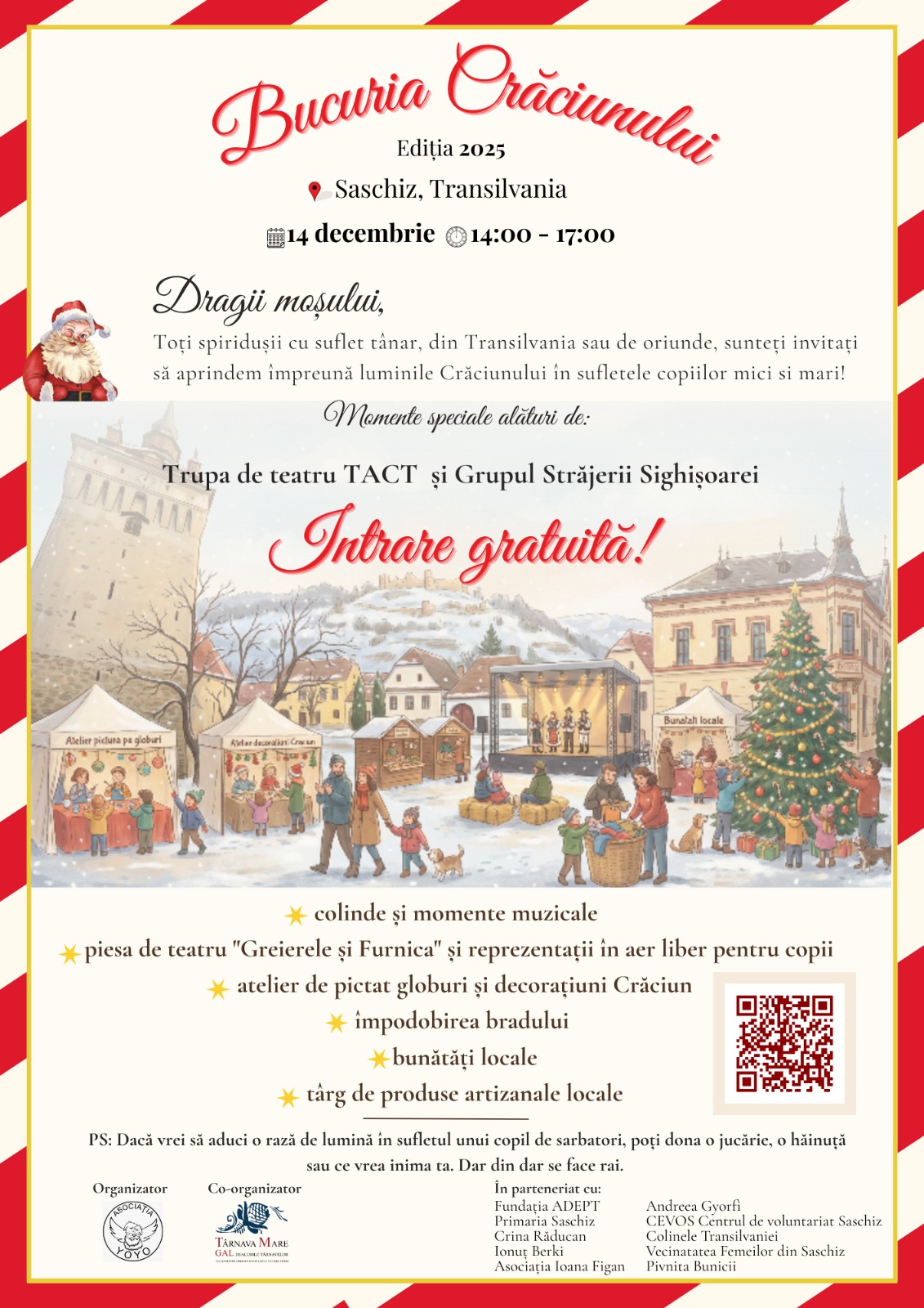 Partenaires : Association Tașuleasa Social, Via Transilvanica, École Secondaire « Ion Dacian » et Mairie de Saschiz. Plus de 200 colis-cadeaux ont été distribués.